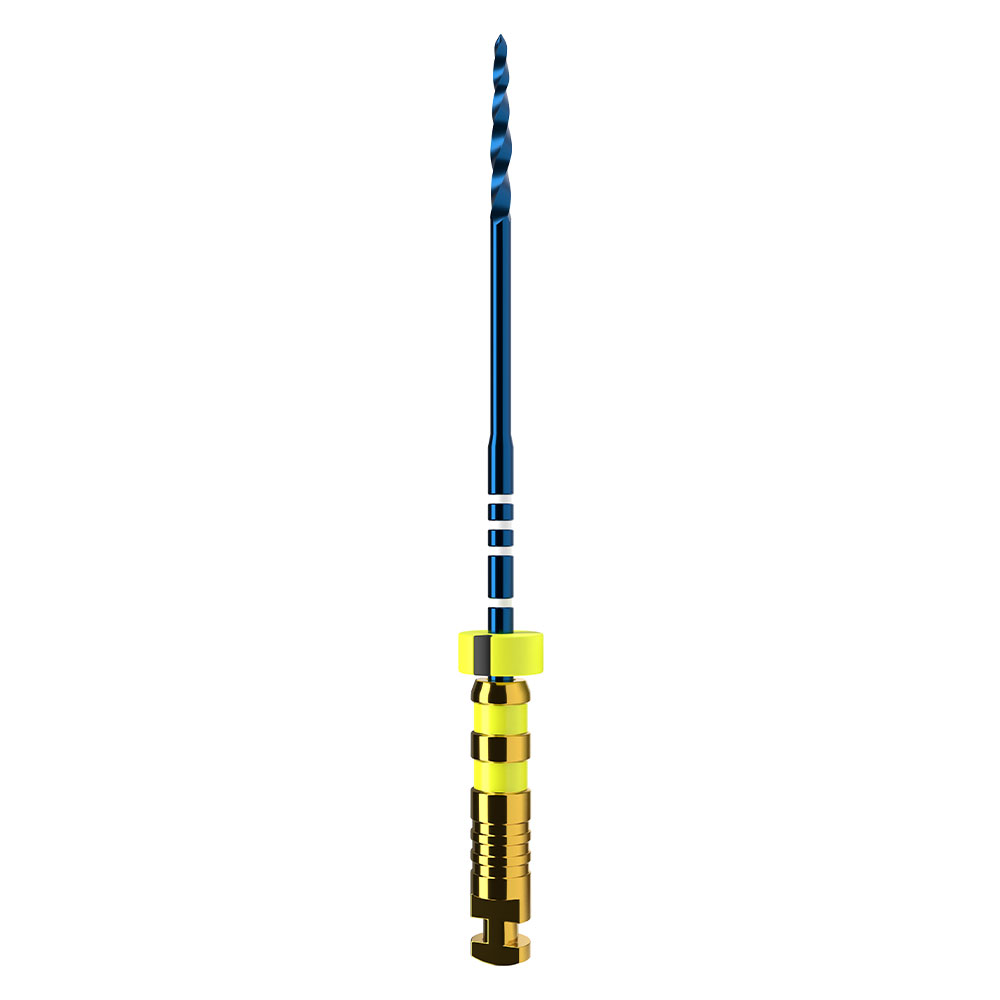 Roterende nikkel-titaniuminstrumenter, ProTaper Ultimate, 31 mm, FXL, Finishing File, gul med 2 ringer, diameter ved spissen 0,50 mm tilsvarende størrelse 50, taper ved spissen er 10%.