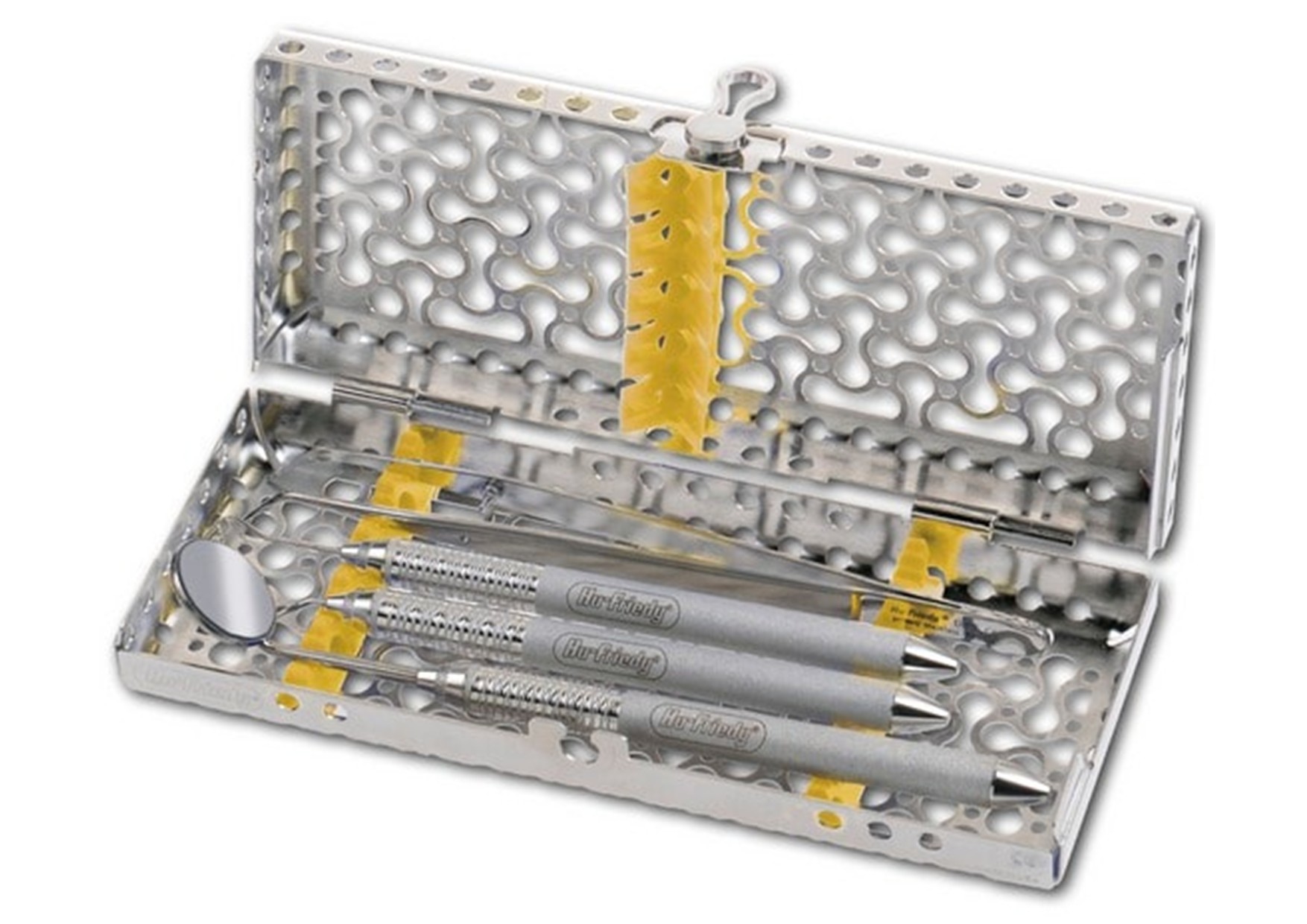 Hu-Friedy kirurgikassett, kvart kassett med plass til 5 instrumenter. Langtidsholdbart rustfritt stål som krever lavt vedlikehold. Hullmønstret design som gir 30% flere åpninger, med myke, gule silikonskinner som holder instrumentene fast under hele steriliseringssyklusen. Mål: 72 x 184 x 34.mm. (Instrumentene på bildet medfølger ikke)