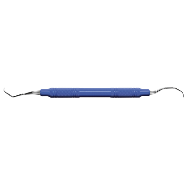 Curette, Gracey +3 Deep Pocket 13-14, forlenget med 3 mm for tilgang til dype periodontale lommer på 5 mm eller dypere samt rotflater, for distal bruk på premolarer og molarer, med blått grep og sølvfargede ender som må slipes.