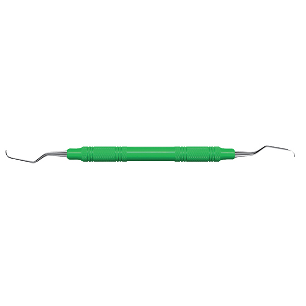 Curette, Gracey +3 Deep Pocket 7-8, forlenget med 3 mm for tilgang til dype periodontale lommer på 5 mm eller dypere samt rotflater, for bruk på molarer, med grønt grep og sølvfargede ender som må/kan slipes.