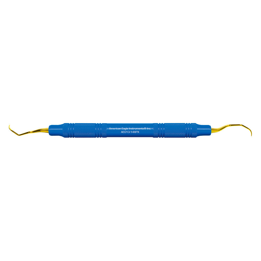 Curette, Gracey Standard, 13-14, for distal bruk på premolarer og molarer, med blått håndtak og gullfargede ender. Må IKKE slipes.