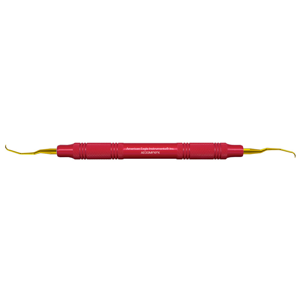 Curette, Dobbel Gracey Mini Posterior, for jeksler, til klasse 1 og klasse 2 furkasjoner, med rødt grep og gullfargede ender. OBS: Må ikke slipes.