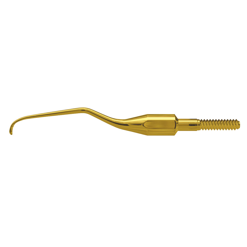 Quik Tip til American Eagle Curette, Gracey (Mini) +3 Access 2, forlenget med 3 mm og med et kortere skjær enn en Gracey Standard. Plasseres enkelt ved rotoverflaten og gir tilgang til trange periodontale lommer og furkasjoner, til lingual bruk i fronten. Gullfarget, festes på American Eagle plasthåndtak. OBS: Må ikke slipes.