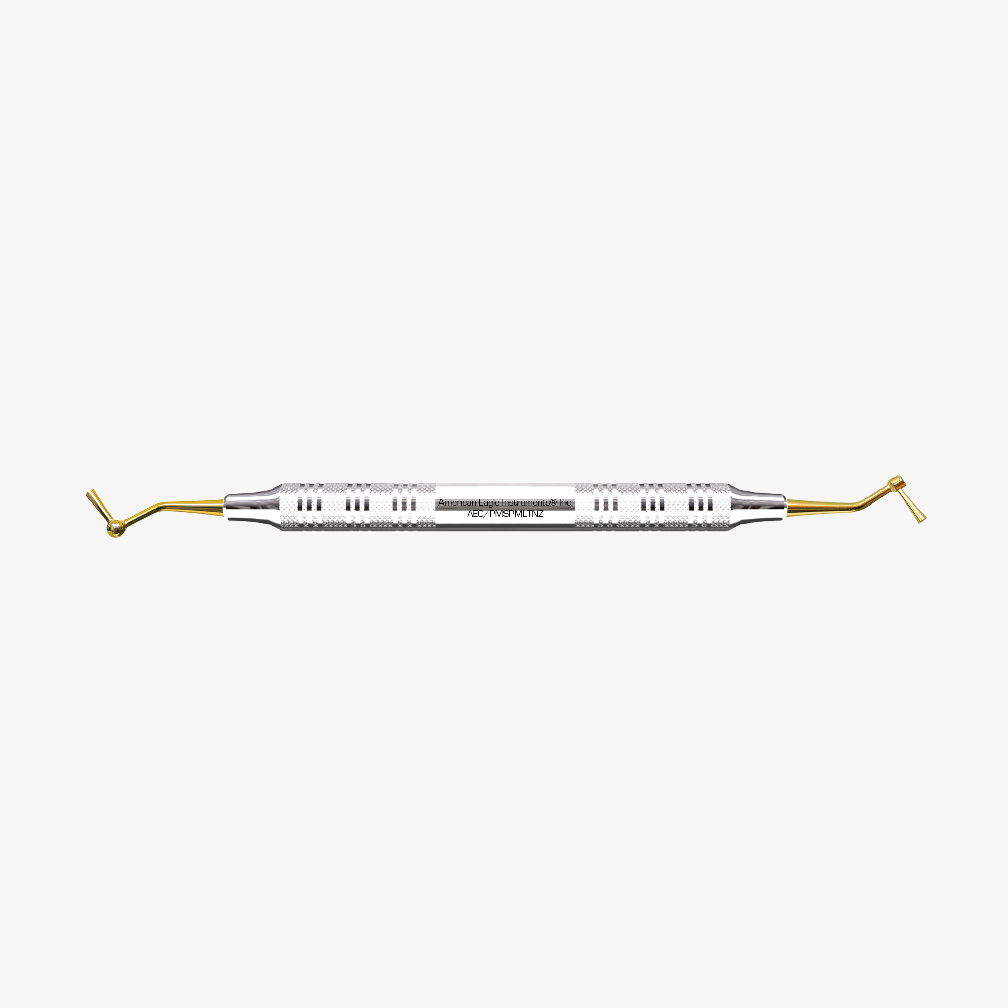 Komposittinstrument fra Dr. Mopper-serien, Super Plugger M/L, spesialutforming med kantet form i den ene enden, tykkelse 1,5 mm, og rund form i den andre enden, tykkelse 2 mm, gullfargede arbeidsdeler på standard skaft i rustfritt stål."