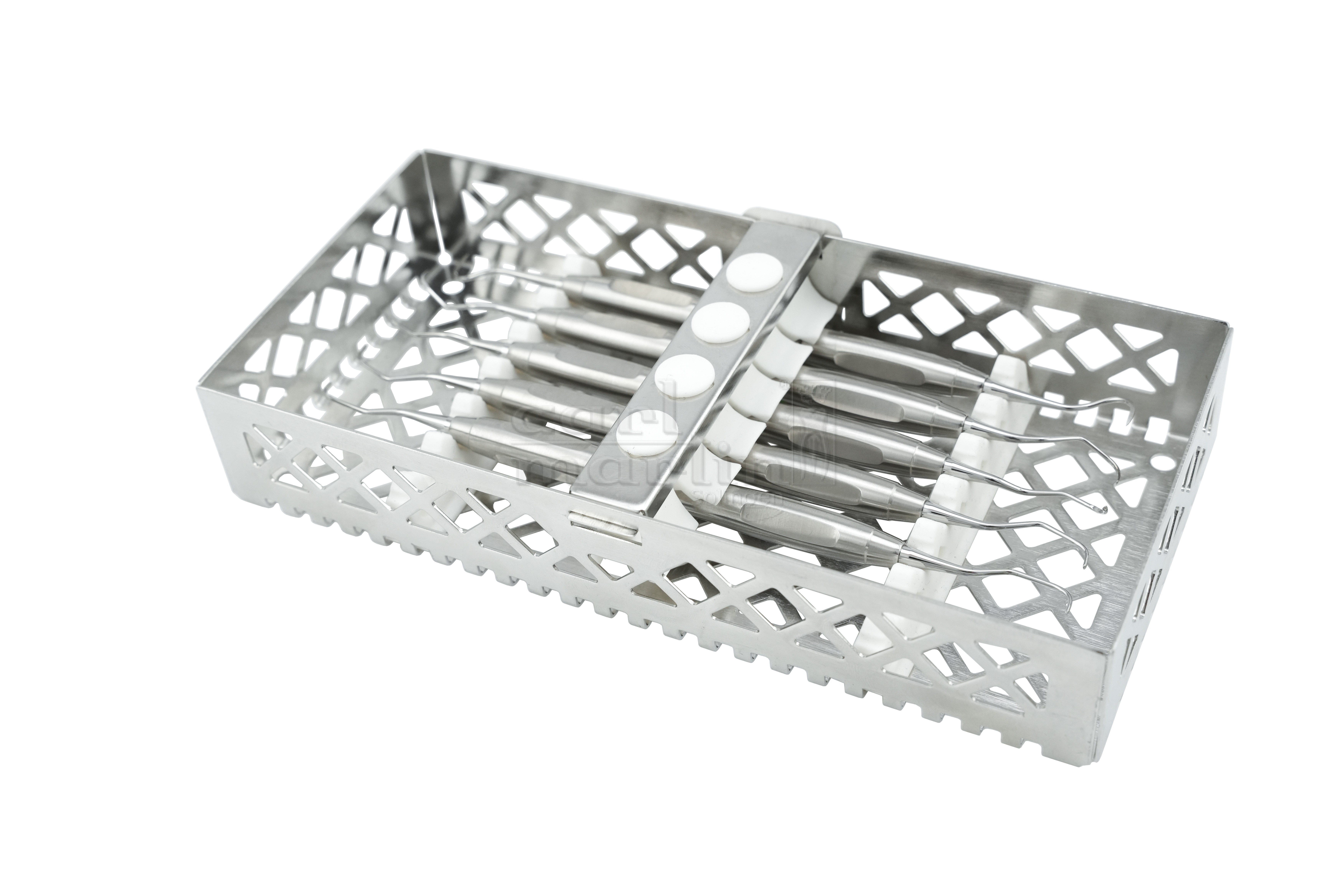 Rustfri stålkassett for 6 instrumenter, 190 × 90 × 30 mm, med hvit silikonholder. (instrumenter medfølger ikke)