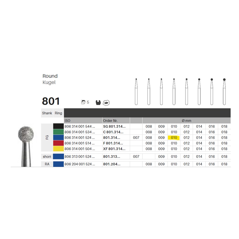 Diamantbor med flere diamantlag i den skjærende delen, noe som gjør boret mer holdbart, effektivt og stabilt. Med "Multilayer Diamond Instrument Guarantee", som er produsentens garanti for et bor med god skjæreevne over lengre tid. Til preparering, for FG, rundt, medium med blå ring, hodelengde 1 mm, 001/010 M (801).