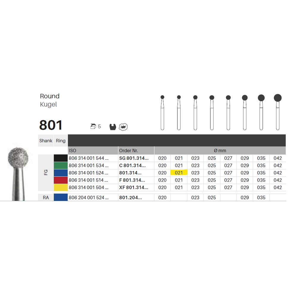 Diamantbor med flere diamantlag i den skjærende delen, noe som gjør boret mer holdbart, effektivt og stabilt. Med "Multilayer Diamond Instrument Guarantee", som er produsentens garanti for et bor med god skjæreevne over lengre tid. Til preparering, for FG, rundt, medium med blå ring, hodelengde 2,1 mm, 001/021 M (801).