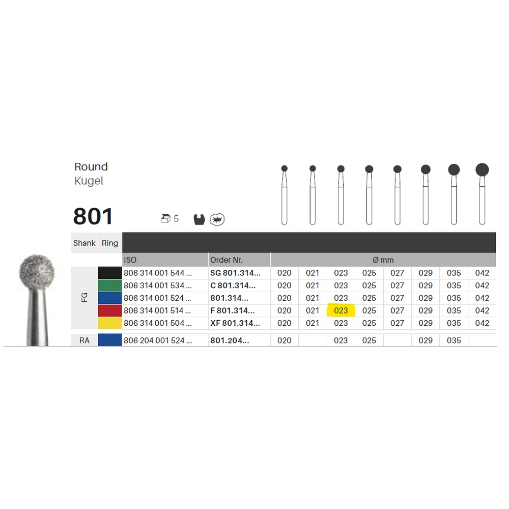 Diamantbor med flere diamantlag i den skjærende delen, noe som gjør boret mer holdbart, effektivt og stabilt. Med "Multilayer Diamond Instrument Guarantee", som er produsentens garanti for et bor med god skjæreevne over lengre tid. Til pussing, for FG, rundt, fin med rød ring, hodelengde 2,3 mm, 001/023 F (801).