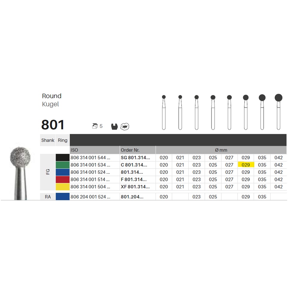 Diamantbor med flere diamantlag i den skjærende delen, noe som gjør boret mer holdbart, effektivt og stabilt. Med "Multilayer Diamond Instrument Guarantee", som er produsentens garanti for et bor med god skjæreevne over lengre tid. Til preparering, for FG, rund, grov med grønn ring, hodelengde 2,9 mm, 001/029 C (801).