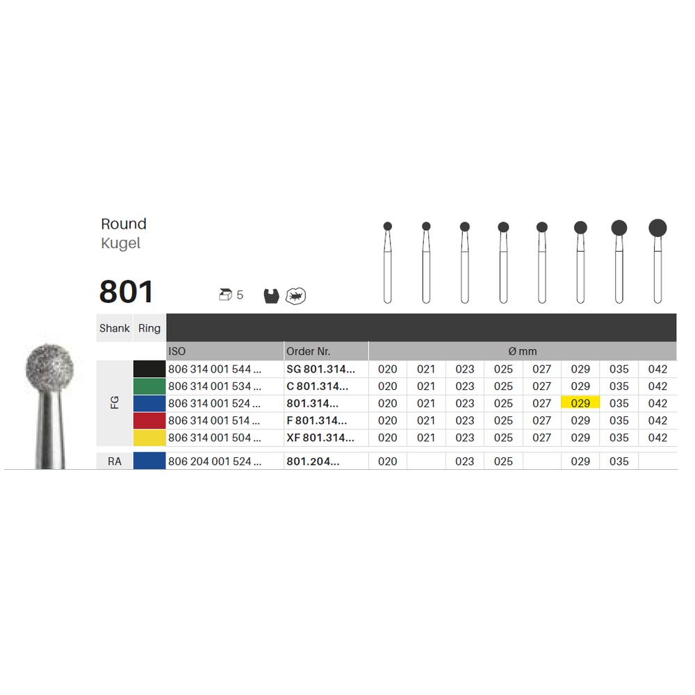 Diamantbor med flere diamantlag i den skjærende delen, noe som gjør boret mer holdbart, effektivt og stabilt. Med "Multilayer Diamond Instrument Guarantee", som er produsentens garanti for et bor med god skjæreevne over lengre tid. Til preparering, for FG, rundt, medium med blå ring, hodelengde 2,9 mm, 001/029 M (801).