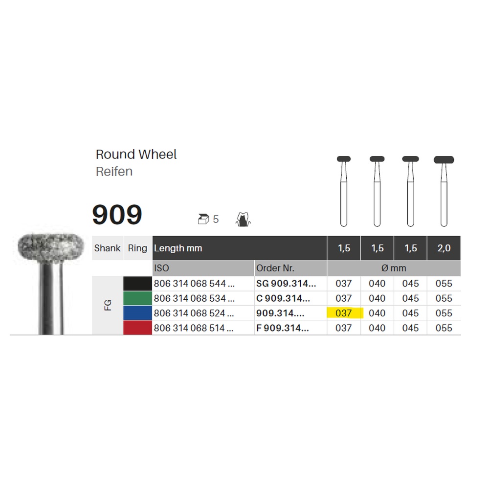 Diamantbor med flere diamantlag i den skjærende delen, slik at boret er mer holdbart, effektivt og stabilt. Med "Multilayer Diamond Instrument Guarantee", som er produsentens garanti for et bor med god skjæreevne over lengre tid. Til preparering, for FG, hjulformet med avrundede kanter, medium med blå ring, hovedlengde 1,5 mm, 068/037 M (909).