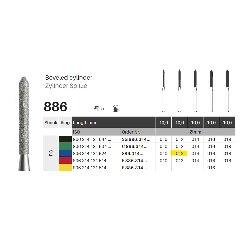 Diamantbor med flere diamantlag i den skjærende delen, slik at boret er mer holdbart, effektivt og stabilt. Med "Multilayer Diamond Instrument Guarantee", som er produsentens garanti for et bor med god skjæreevne over lengre tid. Til preparering, for FG, sylinderformet med spiss topp, medium med blå ring, hovedlengde 10 mm, 131/012 M (886).