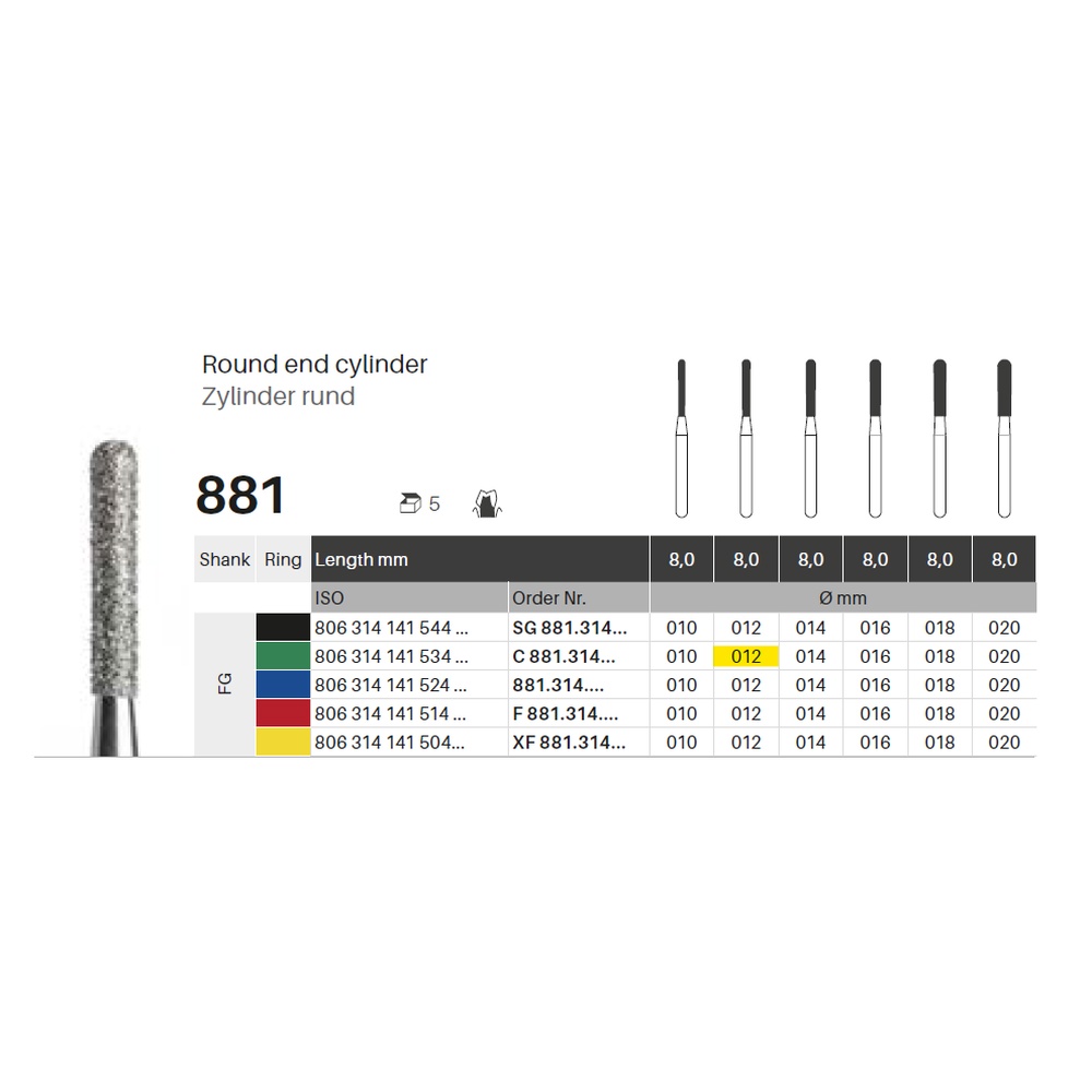 Diamantbor med flere diamantlag i den skjærende delen, slik at boret er mer holdbart, effektivt og stabilt. Med "Multilayer Diamond Instrument Guarantee", som er produsentens garanti for et bor med god skjæreevne over lengre tid. Til preparering, for FG, sylinderformet med rund topp, grov med grønn ring, hovedlengde 8 mm, 141/012 C (881).