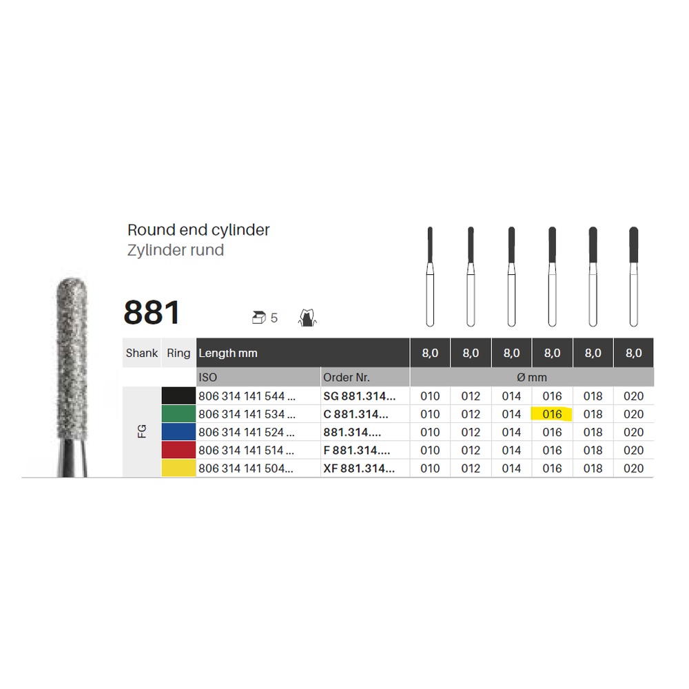Diamantbor med flere diamantlag i den skjærende delen, slik at boret er mer holdbart, effektivt og stabilt. Med "Multilayer Diamond Instrument Guarantee", som er produsentens garanti for et bor med god skjæreevne over lengre tid. Til preparering, for FG, sylinderformet med rund topp, grov med grønn ring, hovedlengde 8 mm, 141/016 C (881).