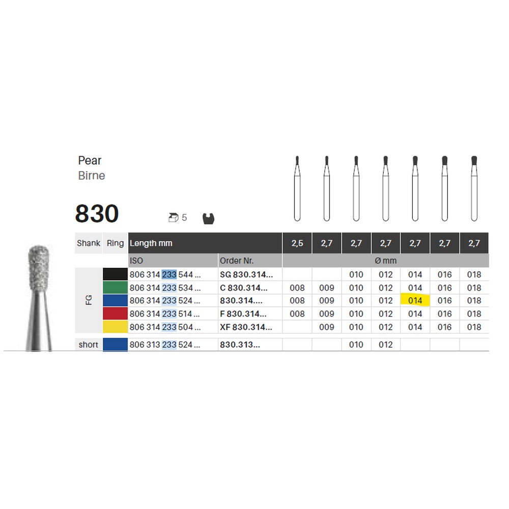 Diamantbor med flere diamantlag i den skjærende delen, slik at boret er mer holdbart, effektivt og stabilt. Med ‘Multilayer Diamond Instrument Guarantee’, som er produsentens garanti for et bor med god skjæreevne over lengre tid. Til preparering, for FG, pæreformet, medium med blå ring, hovedlengde 2,7 mm, 233/014 M (830).