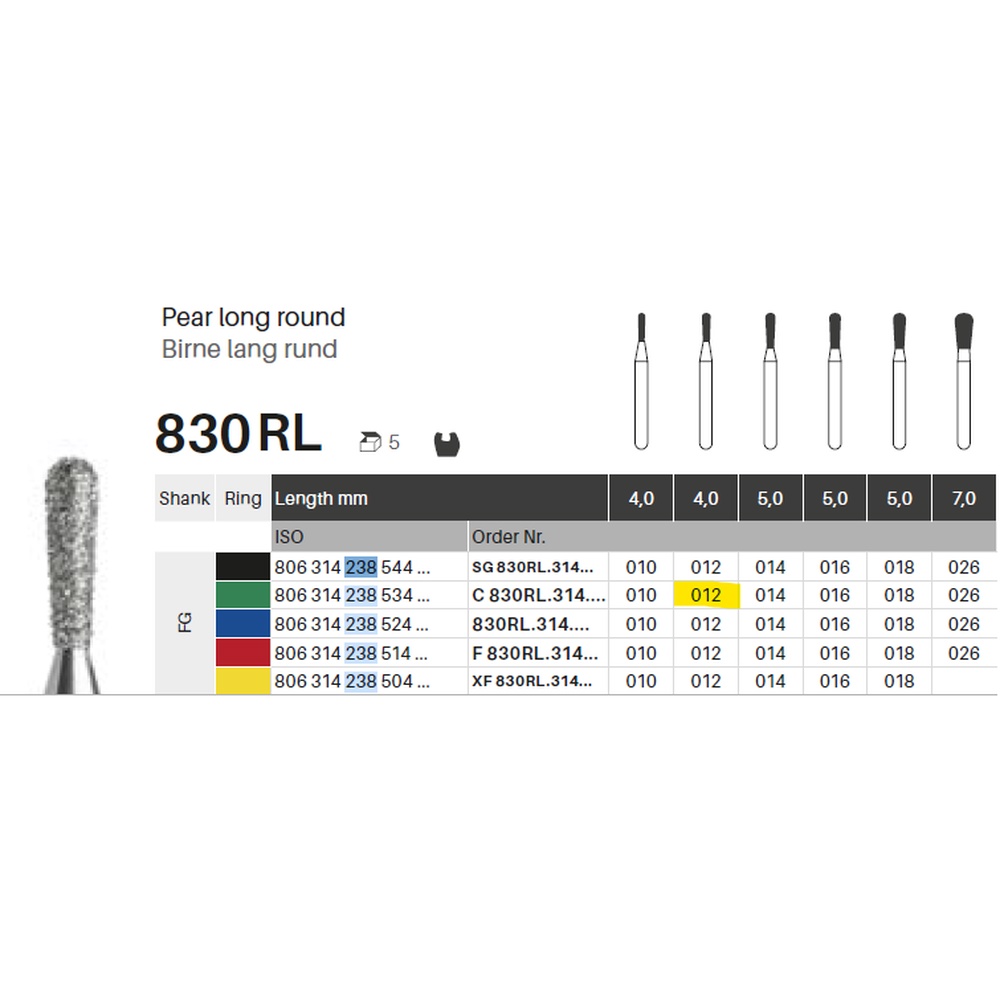 Diamantbor med flere diamantlag i den skjærende delen, slik at boret er mer holdbart, effektivt og stabilt. Med ‘Multilayer Diamond Instrument Guarantee’, som er produsentens garanti for et bor med god skjæreevne over lengre tid. Til preparering, for FG, lang, rund pæreformet, grov med grønn ring, hovedlengde 4 mm, 238/012 C (830RL).