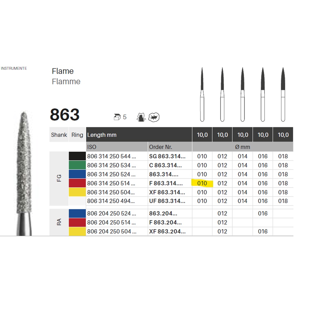 Diamantbor med flere diamantlag i den skjærende delen, slik at boret er mer holdbart, effektivt og stabilt. Med «Multilayer Diamond Instrument Guarantee», som er produsentens garanti for et bor med god skjæreevne over lengre tid. Til pussing, for FG, flammeformet, fin med rød ring, hovedlengde 10 mm, 250/010 F (863).