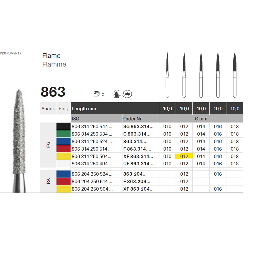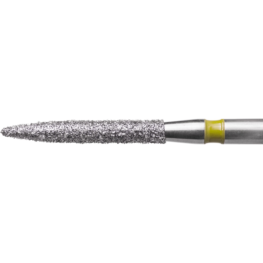 Diamantbor med flere diamantlag i den skjærende delen, slik at boret er mer holdbart, effektivt og stabilt. Med "Multilayer Diamond Instrument Guarantee", som er produsentens garanti for et bor med god skjæreevne over lengre tid. Til pussing, for FG, flammeformet, ekstra-fin med gul ring, hovedlengde 10 mm, 250/012 XF (863).