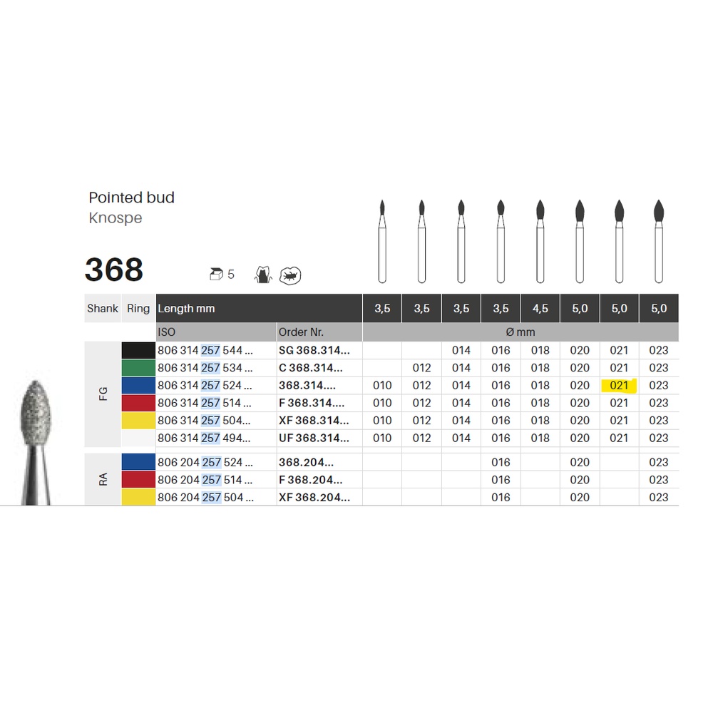 Diamantbor med flere diamantlag i den skjærende delen, noe som gjør boret mer holdbart, effektivt og stabilt. Med «Multilayer Diamond Instrument Guarantee», som er produsentens garanti for et bor med god skjæreevne over lengre tid. Til polering, for FG, knoppformet, medium med blå ring, hodelengde 5 mm, 257/021 M (368).