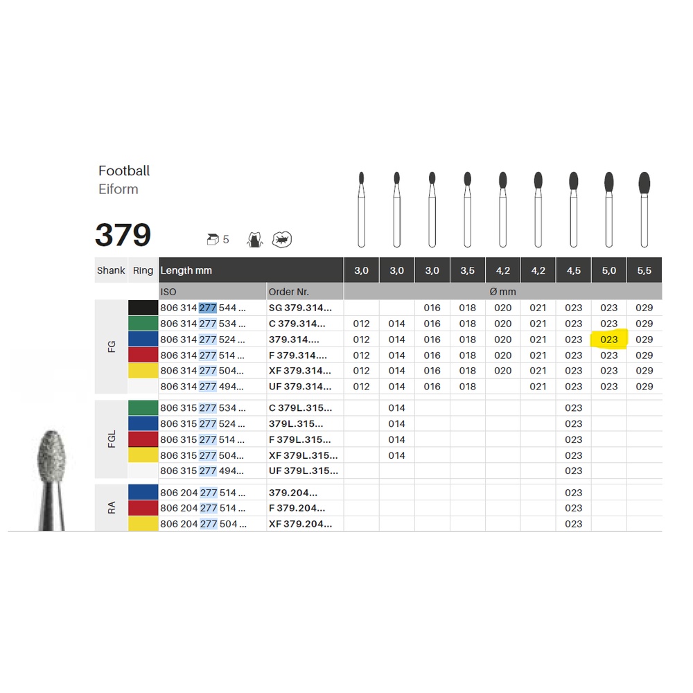 Diamantbor med flere diamantlag i den skjærende delen, noe som gjør boret mer holdbart, effektivt og stabilt. Med «Multilayer Diamond Instrument Guarantee», som er produsentens garanti for et bor med god skjæreevne over lengre tid. Til preparering, for FG, amerikansk fotball-/eggformet, medium med blå ring, hodelengde 5 mm, 277/023 M (379).