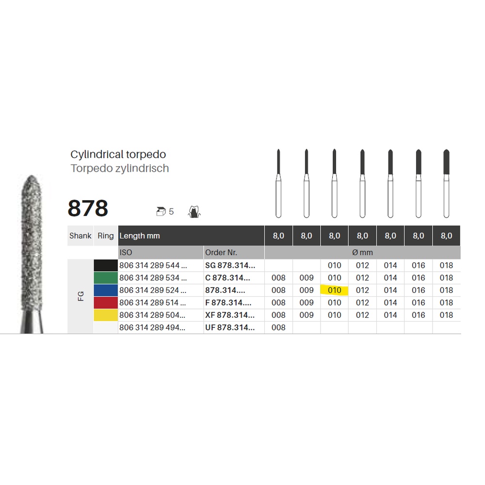 Diamantbor med flere diamantlag i den skjærende delen, slik at boret er mer holdbart, effektivt og stabilt. Med "Multilayer Diamond Instrument Guarantee", som er produsentens garanti for et bor med god skjæreevne over lengre tid. Til preparering, for FG, torpedoformet, medium med blå ring, hovedlengde 8 mm, 289/010 M (878).