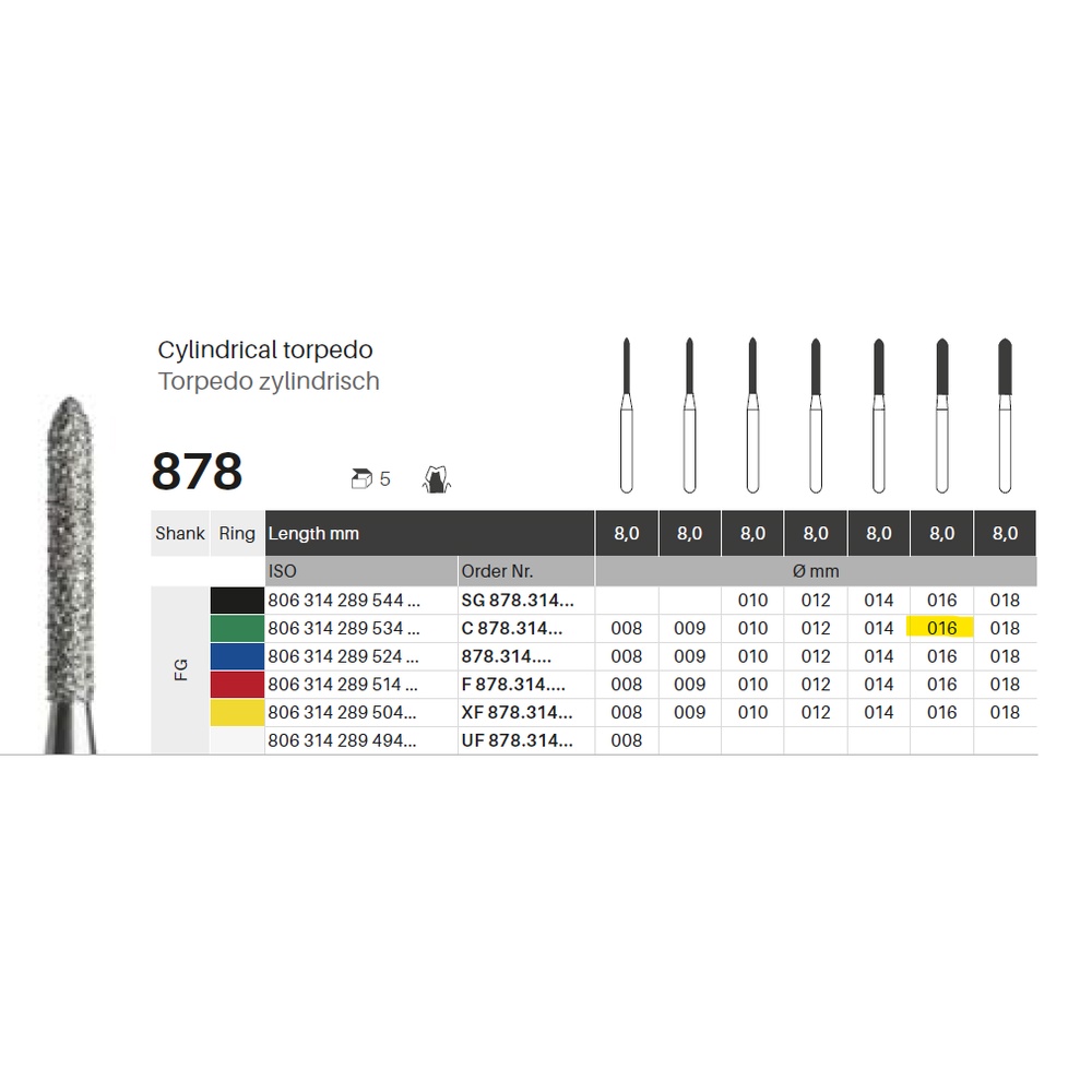 Diamantbor med flere diamantlag i den skjærende delen, slik at boret er mer holdbart, effektivt og stabilt. Med "Multilayer Diamond Instrument Guarantee", som er produsentens garanti for et bor med god skjæreevne over lengre tid. Til preparering, for FG, torpedoformet, grov med grønn ring, hovedlengde 8 mm, 289/016 C (878).