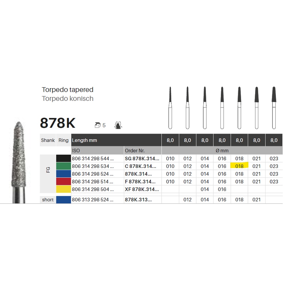 Diamantbor med flere diamantlag i den skjærende delen, slik at boret er mer holdbart, effektivt og stabilt. Med "Multilayer Diamond Instrument Guarantee", som er produsentens garanti for et bor med god skjæreevne over lengre tid. Til preparering, for FG, torpedoformet, grov med grønn ring, hovedlengde 8 mm, 289/018 C (878).