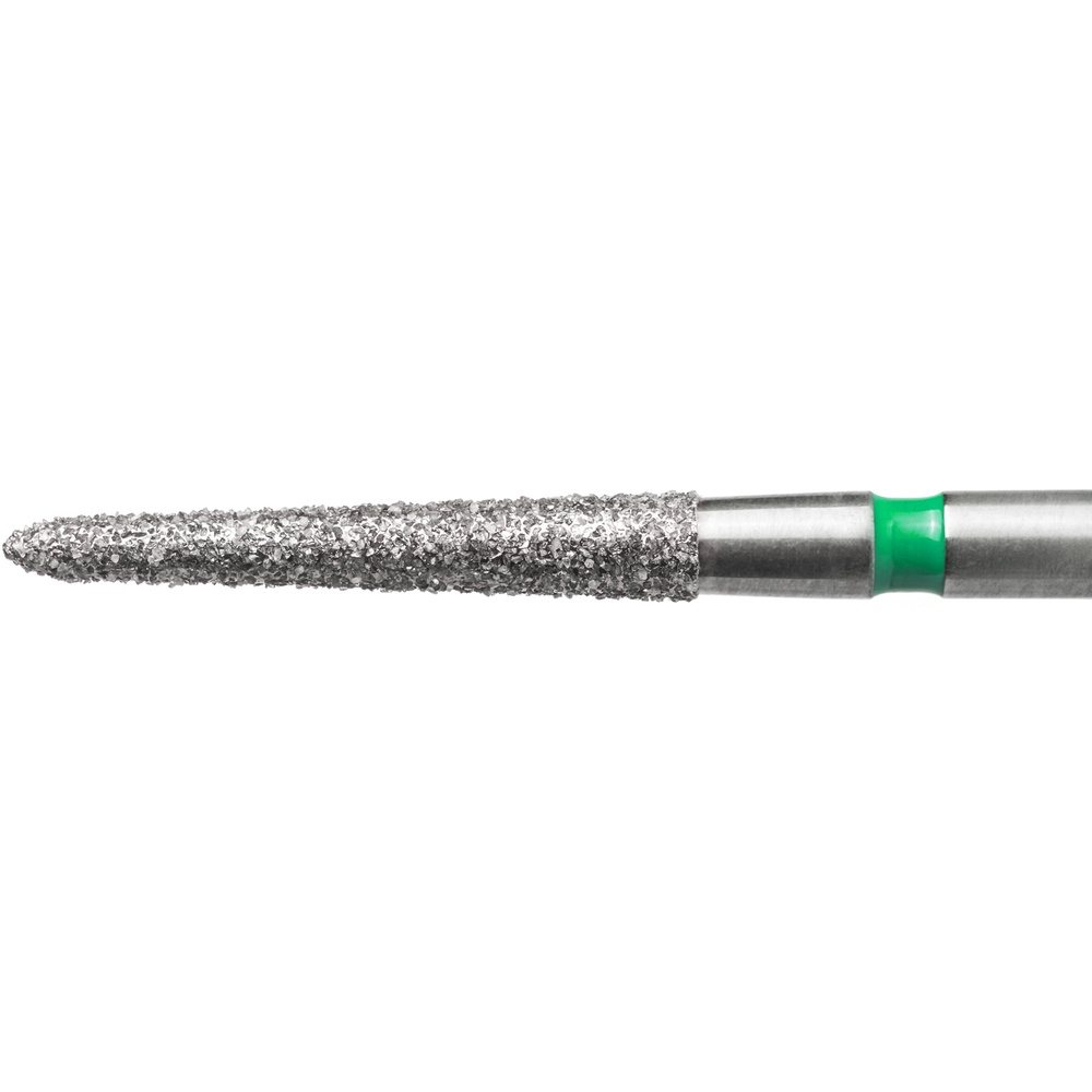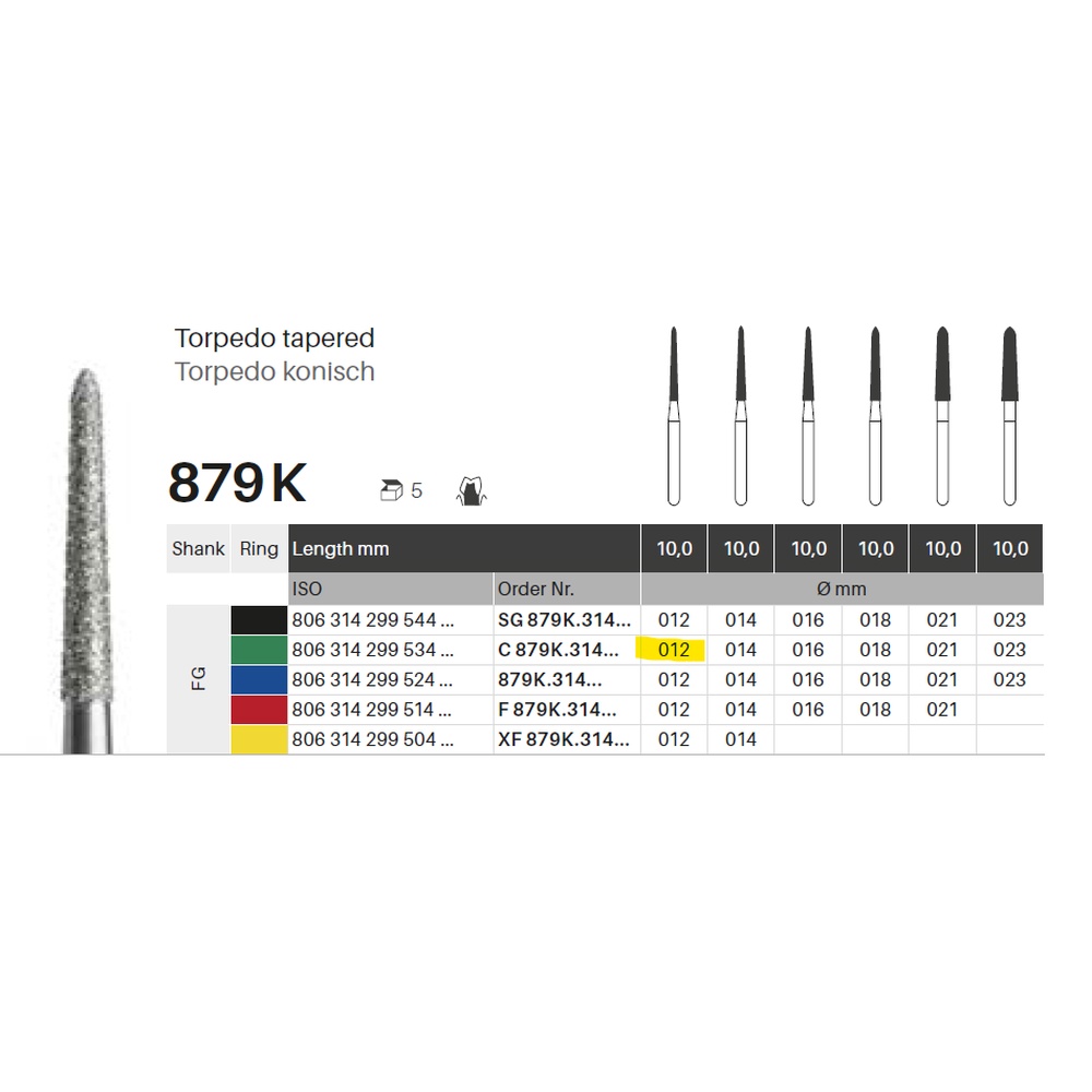 Diamantbor med flere diamantlag i den skjærende delen, slik at boret er mer holdbart, effektivt og stabilt. Med "Multilayer Diamond Instrument Guarantee", som er produsentens garanti for et bor med god skjæreevne over lengre tid. Til preparering, for FG, konisk torpedoformet, grov med grønn ring, hovedlengde 10 mm, 299/012 C (879K).