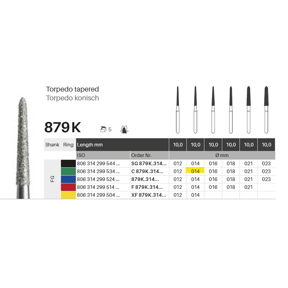 Diamantbor med flere diamantlag i den skjærende delen, slik at boret er mer holdbart, effektivt og stabilt. Med "Multilayer Diamond Instrument Guarantee", som er produsentens garanti for et bor med god skjæreevne over lengre tid. Til preparering, for FG, konisk torpedoformet, grov med grønn ring, hovedlengde 10 mm, 299/014 C (879K).