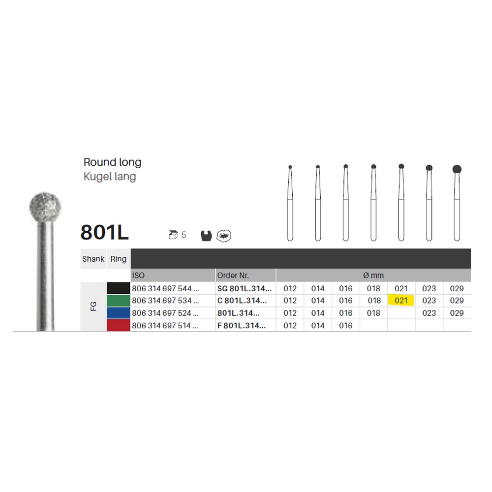Diamantbor med flere diamantlag i den skjærende delen, noe som gjør boret mer holdbart, effektivt og stabilt. Med "Multilayer Diamond Instrument Guarantee", som er produsentens garanti for et bor med god skjæreevne over lengre tid. Til preparering, for FG, rund med forlenget skaft, grov med grønn ring, hodelengde 2,1 mm, 697/021 M (801L).