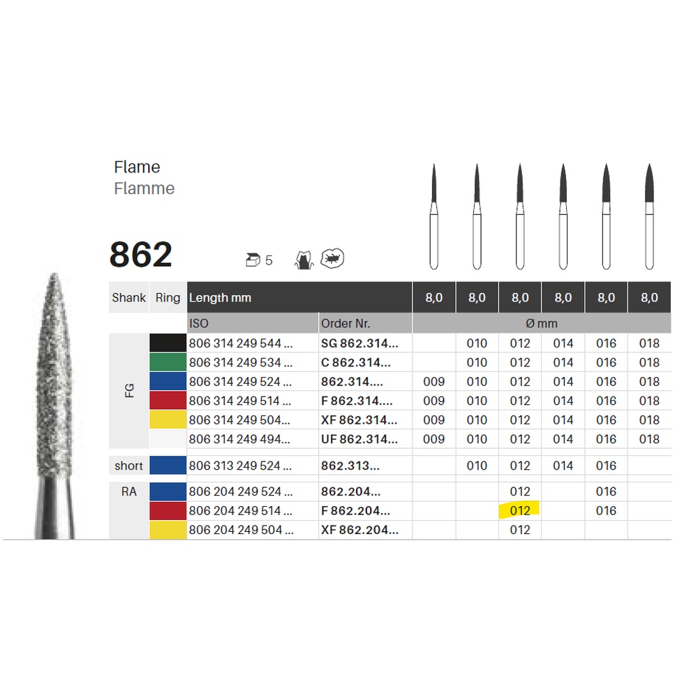 Diamantbor med flere diamantlag i den skjærende delen, slik at boret er mer holdbart, effektivt og stabilt. Med "Multilayer Diamond Instrument Guarantee", som er produsentens garanti for et bor med god skjæreevne over lengre tid. Til pussing, for RA, flammeformet, fin med rød ring, hovedlengde 8 mm, 249/012 F (862).