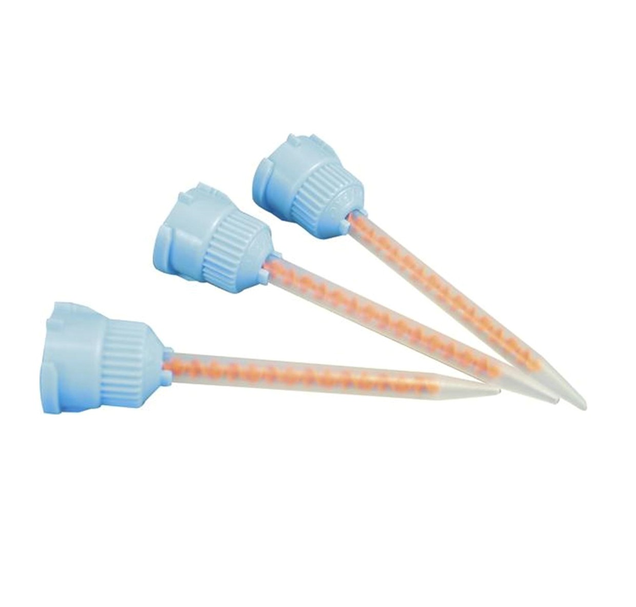 Blandespisser med blått skaft og orange spiral, til provisoriske krone-/bromaterialer.