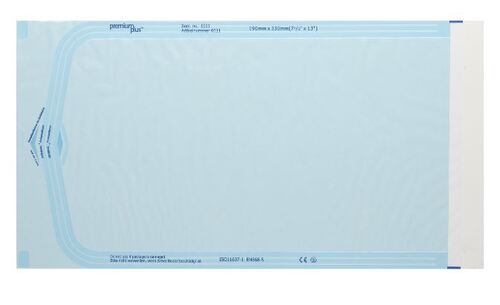 Papir/plast, til autoklavering, dampgjennomtrengelig, bakterietett papir med indikator på den ene siden og plast på den andre, med selvlukk, 19 x 36cm.